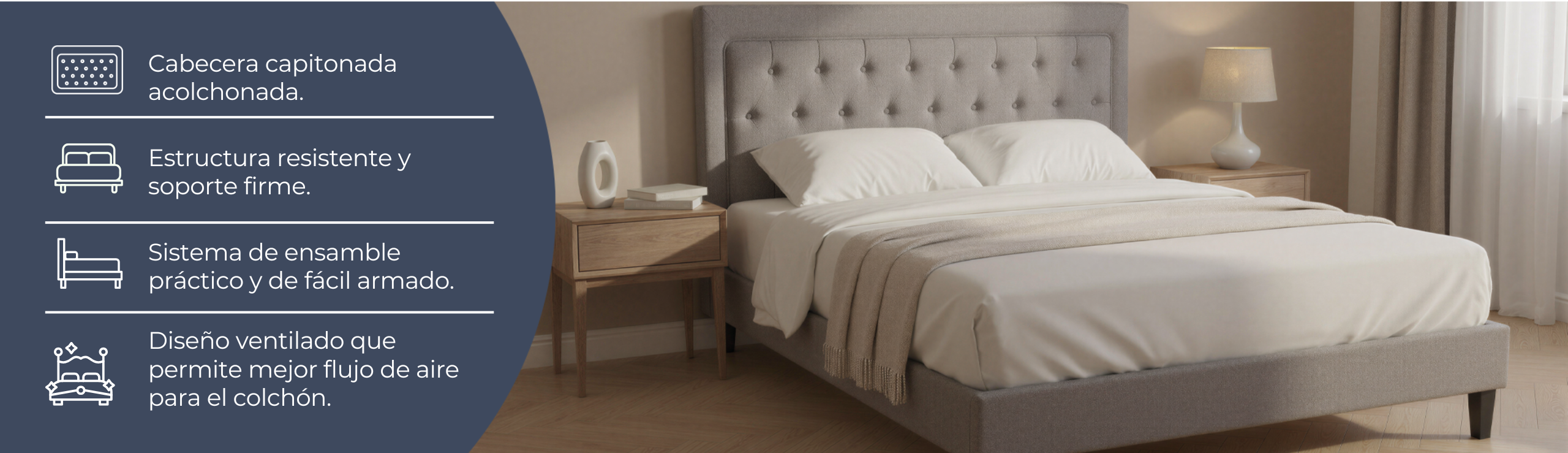La cama Linen armable combina estilo y comodidad con una cabecera capitonada de diseño elegante y acolchonado. Su estructura resistente ofrece estabilidad, mientras que el sistema de ensamblaje facilita su armado. La base proporciona un soporte firme y una buena ventilación para el colchón, asegurando durabilidad y confort.