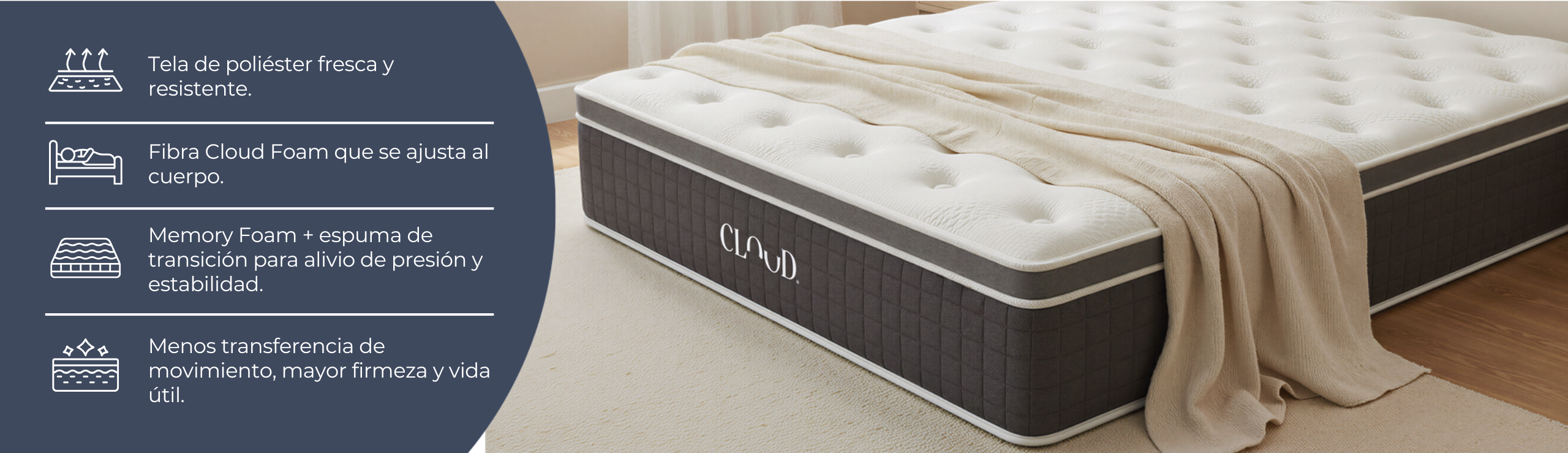 Descubre un descanso excepcional con el Colchón Cloudr Pro Hybrid Tech, diseñado con 10 capas que combinan tecnología avanzada y confort. Su tela cool feel hipoalergénica mantiene una sensación fresca y saludable, mientras que el memory foam de alta densidad y el memory gel cloudr se adaptan a tu cuerpo para aliviar la presión. Incluye resortes pocket cloudr confort que ofrecen soporte independiente y estabilidad, complementados por espuma ventilada y tela antimovimiento para noches tranquilas.