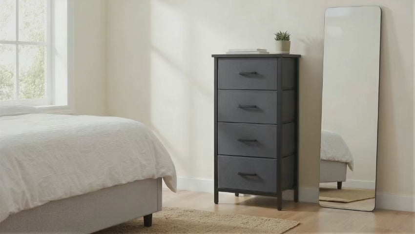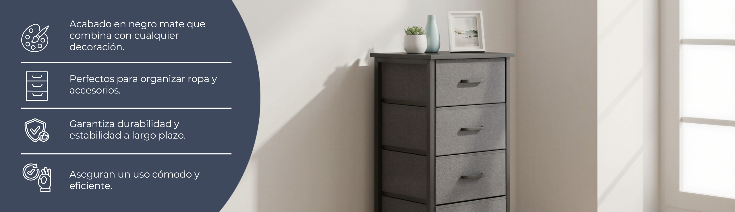 Cuenta con cuatro cajones espaciosos, ideales para organizar ropa, accesorios y otros objetos. Su estructura robusta garantiza durabilidad y estabilidad, mientras que sus correderas de fácil deslizamiento permiten un uso cómodo y eficiente.