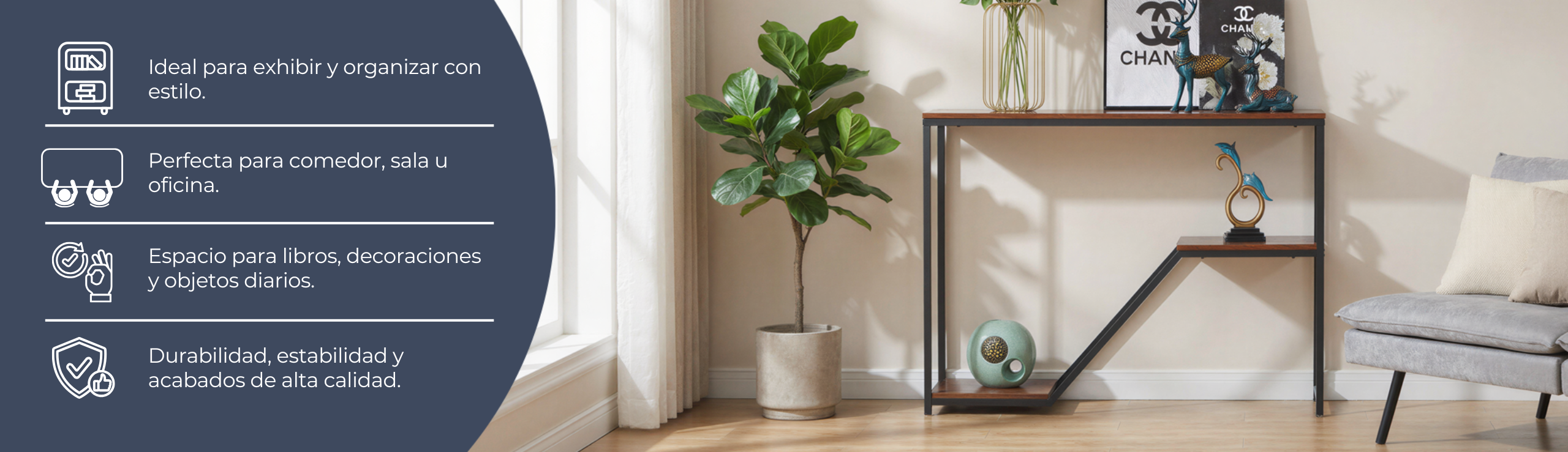 Cuenta con amplios estantes abiertos, ideales para acomodar libros, decoraciones o artículos de uso diario. Su construcción resistente y acabados de alta calidad aseguran durabilidad y estabilidad, mientras que su diseño versátil se adapta a diferentes estilos de decoración, desde contemporáneo hasta industrial.