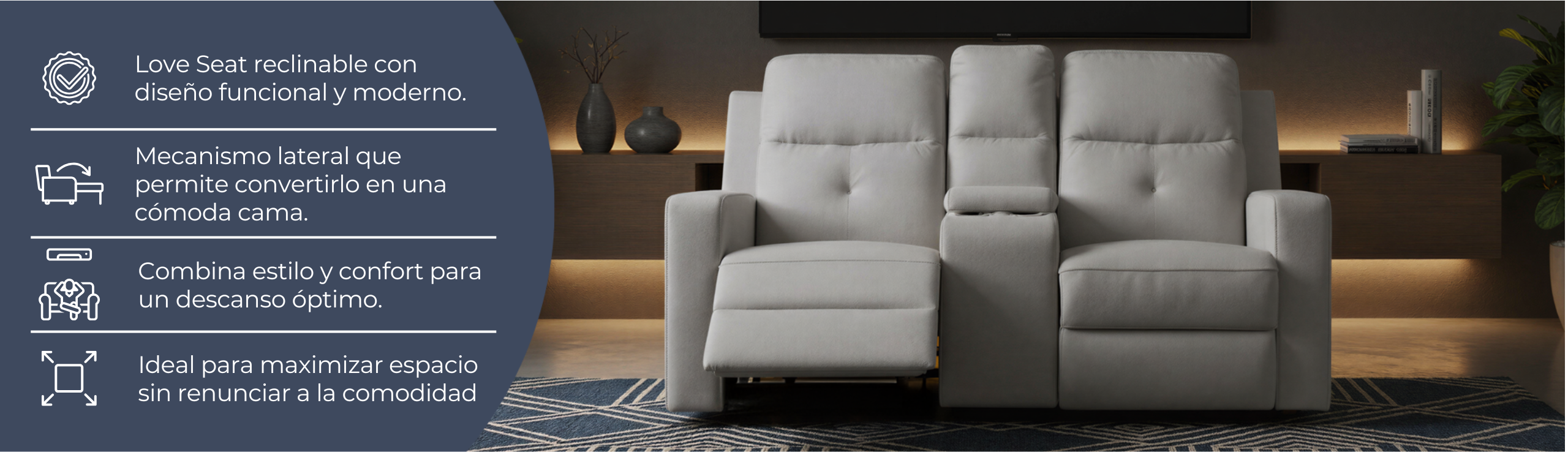 El Love Seat reclinable moon combina funcionalidad y estilo para brindarte el máximo confort, Utiliza la función reclinable ubicada a un costado para transformarlo en una cómoda cama.