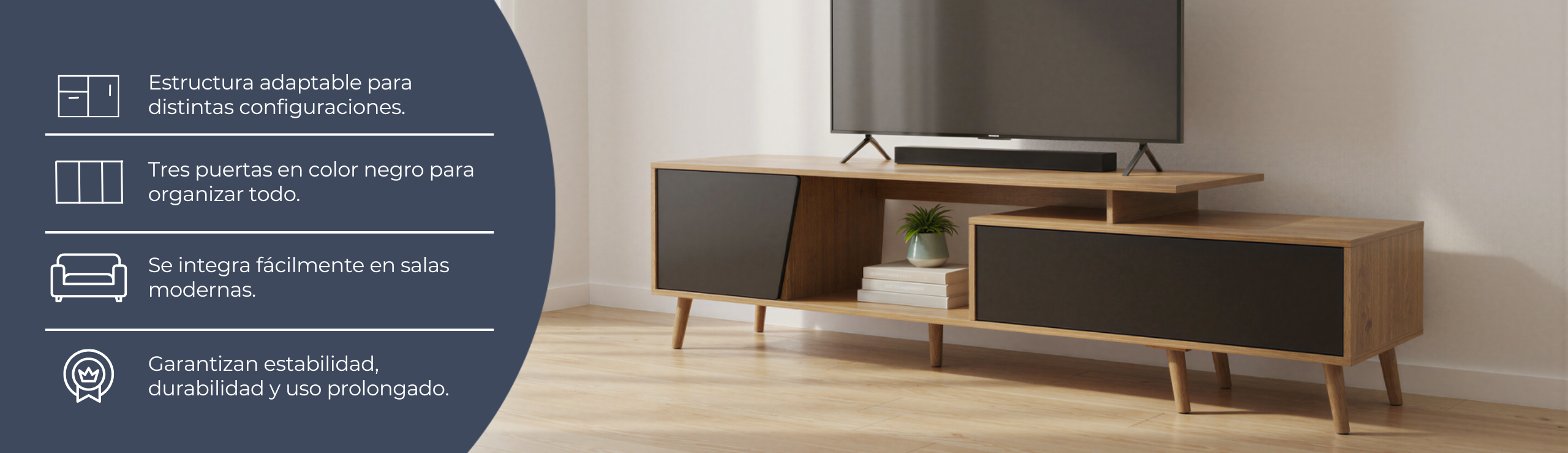 Cuenta con tres puertas en color negro, ideales para mantener organizados libros, documentos, dispositivos electrónicos o cualquier otro objeto. Su diseño minimalista y elegante se integra fácilmente en salas contemporáneas, brindando un toque sofisticado. Fabricado con materiales resistentes, garantiza estabilidad y durabilidad, convirtiéndose en una opción práctica y estilizada para cualquier hogar.