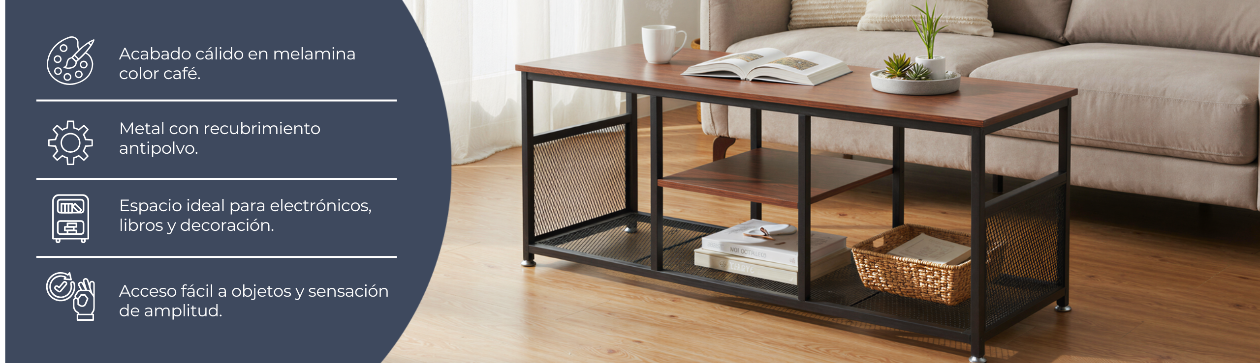 Cuenta con tres niveles de almacenamiento, ideales para organizar dispositivos electrónicos, libros, decoraciones o cualquier otro elemento. Su diseño abierto permite un acceso fácil a los objetos y aporta una sensación de amplitud. Gracias a su combinación de materiales duraderos, es una opción práctica y estilizada para complementar tu sala o área de entretenimiento.