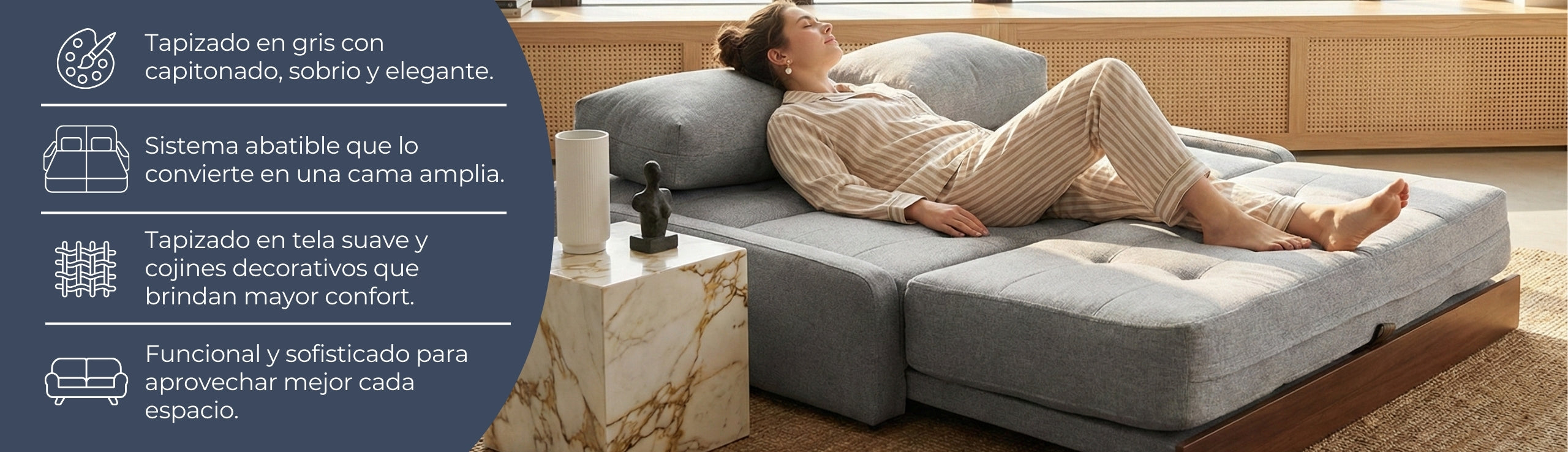 El Sofá cama Floid combina diseño moderno y funcionalidad en una sola pieza. Su estructura compacta se transforma fácilmente de un cómodo sofá a una amplia cama, ideal para recibir visitas o aprovechar al máximo los espacios reducidos. Tapizado en tela gris de textura suave, ofrece un estilo contemporáneo y elegante que se adapta a cualquier ambiente. Su asiento de líneas limpias y cojines firmes brindan un excelente soporte, mientras que el detalle en madera al frente añade un toque cálido y sofisticado. Además, integra un práctico módulo con puertos USB y tomas de corriente, perfecto para cargar dispositivos sin necesidad de moverte. Una opción versátil, moderna y práctica para tu sala, estudio o recámara de invitados.
