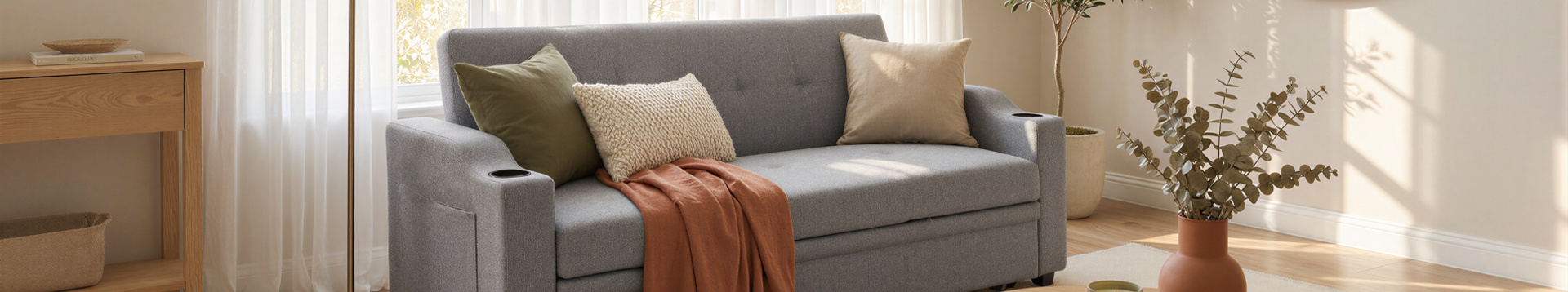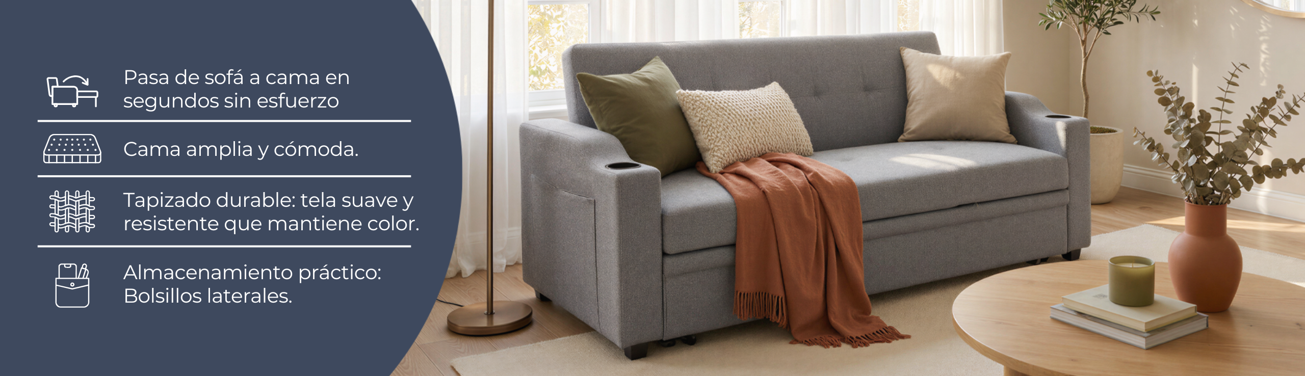 El Sofá Cama Sander es una pieza versátil y funcional, ideal para optimizar tus espacios sin sacrificar estilo ni comodidad. Su diseño moderno en tono gris combina fácilmente con cualquier decoración, mientras que su tapizado en tela suave ofrece resistencia y confort. Cuenta con un práctico sistema desplegable que convierte el sofá en una cómoda cama en cuestión de segundos, perfecto para recibir visitas o descansar en cualquier momento. Sus cojines incluidos brindan mayor soporte y comodidad, y además incorpora portavasos en los brazos, lo que lo hace aún más funcional.