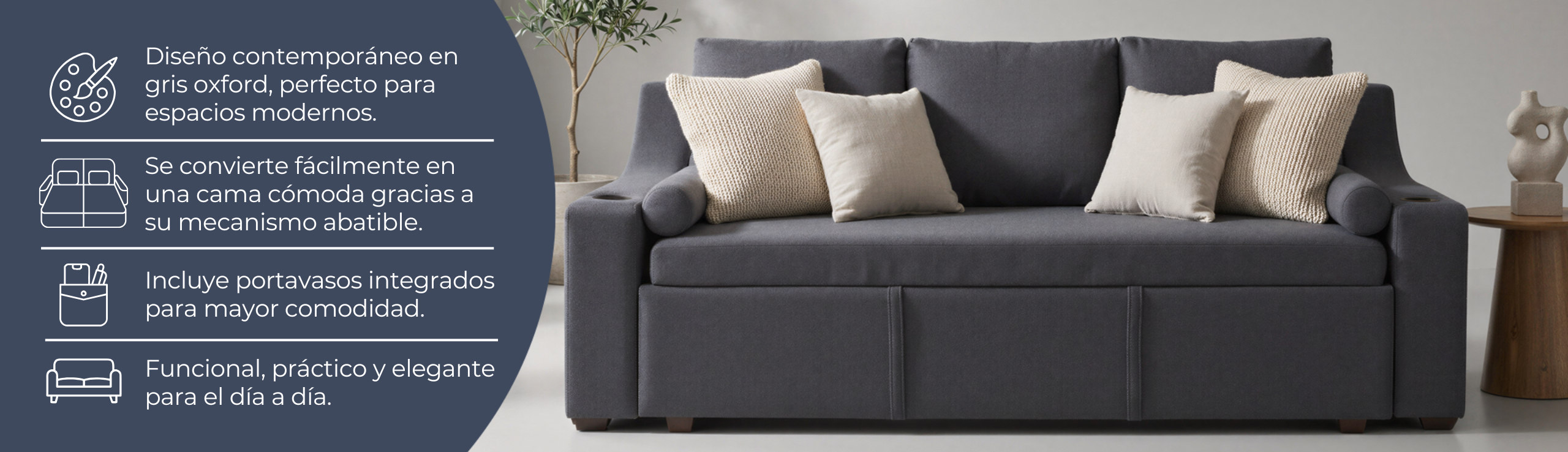 El modelo Stanley es un sofá cama abatible con diseño contemporáneo, ideal para espacios modernos. Tapizado en tela color gris oxford, ofrece una apariencia elegante y versátil. Su mecanismo abatible permite convertirlo fácilmente en una cómoda cama, brindando una superficie amplia para descansar. Además, cuenta con portavasos integrados en los brazos, perfectos para mayor comodidad al ver películas o relajarse. Una excelente opción para quienes buscan funcionalidad con estilo.